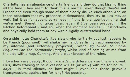 This earned me a rebuke from Charlotte and two of my sisters who declared that this stranger was “only being friendly” and that my action was needlessly (if unintentionally) cruel. No, I insisted, this stranger was being overly friendly and had no business whatsoever trying to inflict her kissy bonhomie upon someone she didn’t know.